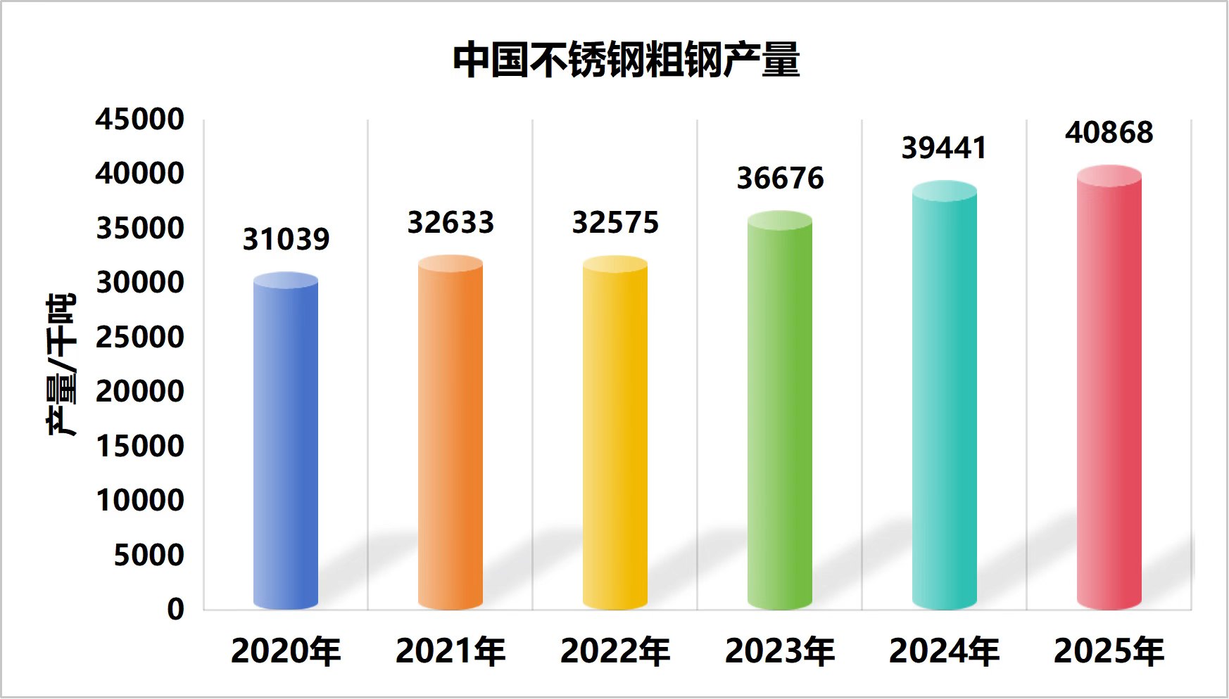 2025年,中国不锈钢粗钢产量4086.81万吨,同比增加142.70万吨,增长3.62%。
