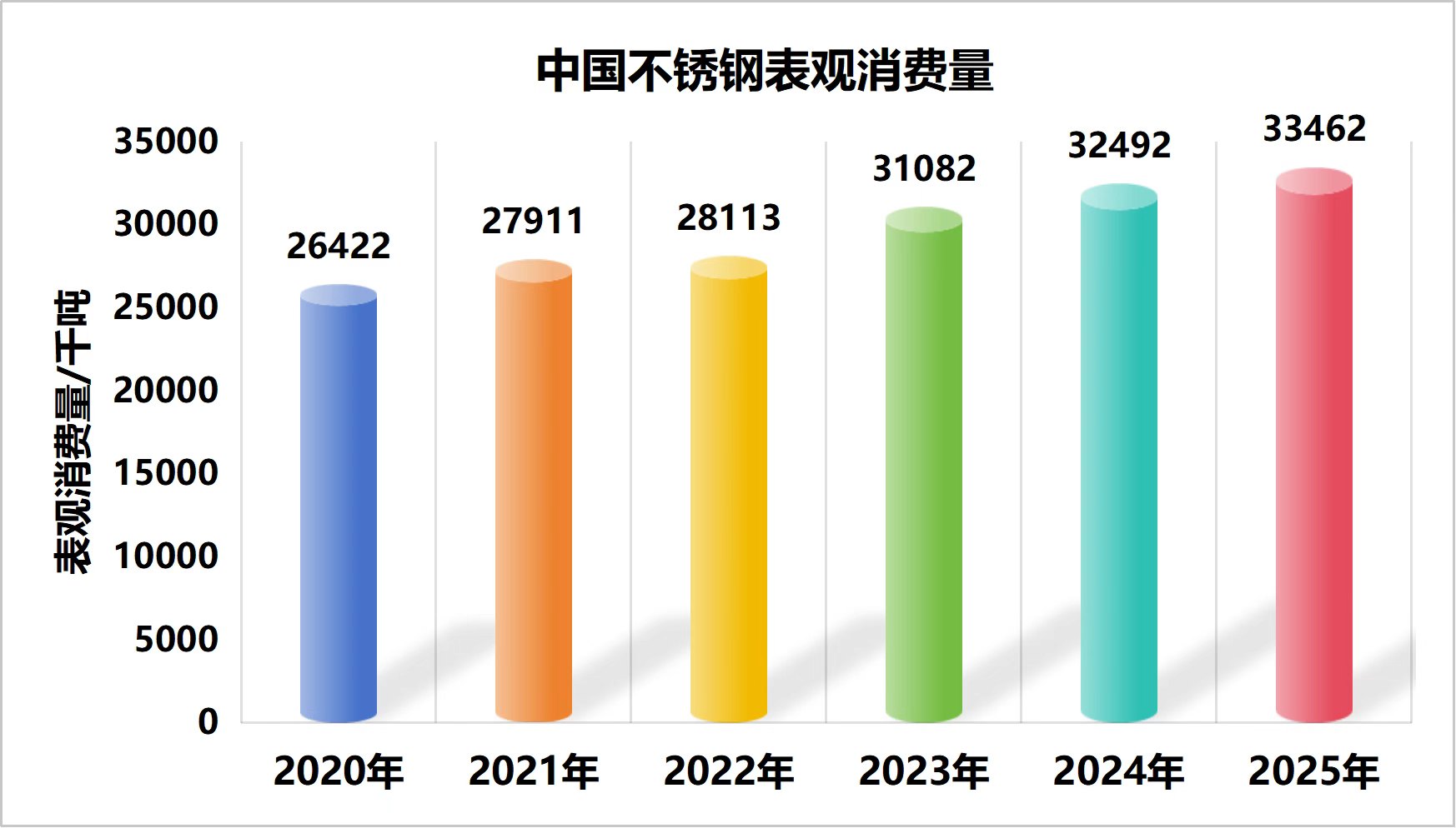 2025年中国不锈钢表观消费量3346.16万吨,同比增加96.96万吨,增长2.98%。