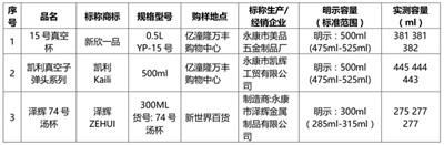 5、保温杯的容量。国家标准要求:产品容量偏差应在公称容量的±5%以内。容量的明示有利于消费者选择合适的产品。规定产品偏差,可防止产品与明示值偏差过大,对消费者使用造成不便。经测试,50种保温杯中5种样品容量实测超过标准规定的最大容量,3种样品容量实测未达到标准规定的最小容量,这3种样品是:
