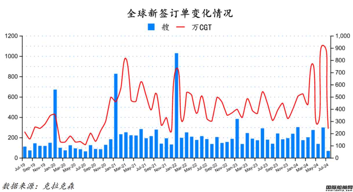 根据克拉克森最新数据统计(截至2024年8月8日),2024年7月份全球新签订单67艘,共计2,431,928CGT。与2024年6月份全球新签订单298艘,共计9,241,062CGT相比较,数量环比减少231艘,修正总吨环比下降73.68%。与2023年7月份全球新签订单178艘,共计4,445,449CGT相比较,数量同比减少111艘,修正总吨同比下降45.29%。