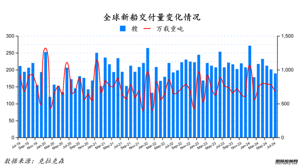 2024年7月份全球船厂共交付新船189艘,共计6,806,530载重吨。与2024年6月份全球新船交付订单201艘,共计7,836,233载重吨相比较,数量环比下跌5.97%,载重吨环比下降13.14%。与2023年7月份全球船厂共交付新船207艘,共计7,625,491载重吨相比较,数量同比下跌8.70%,载重吨同比下降10.74%。