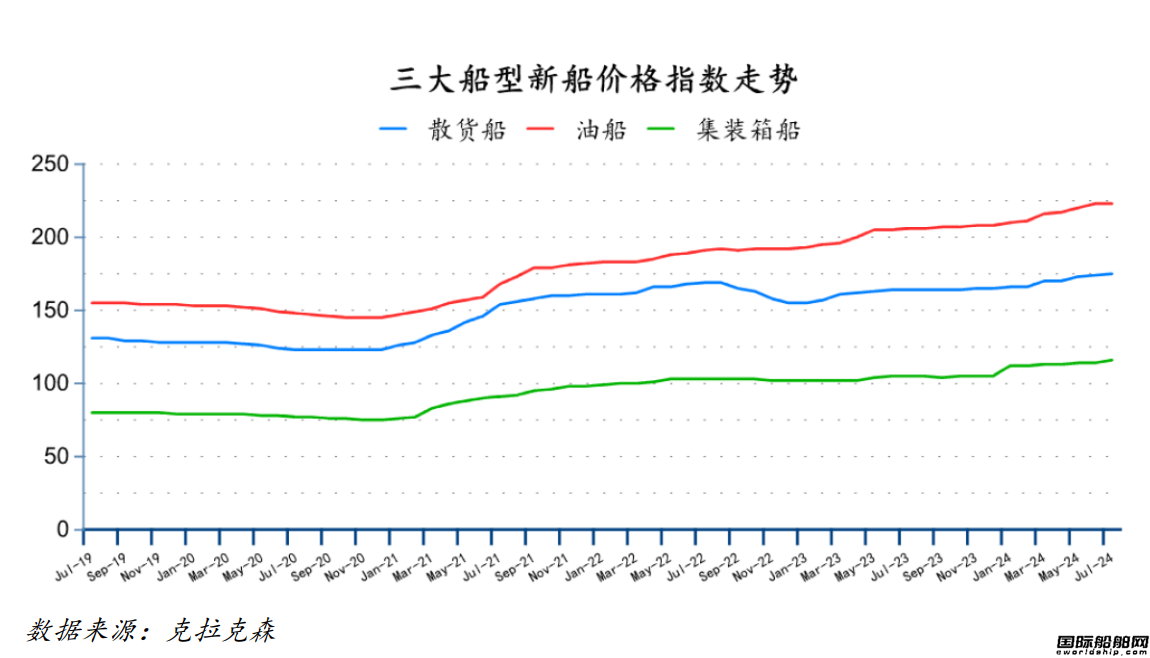 7月份散货船、集装箱船新船价格指数分别环比上升1点、2点至175点、116点;油船新船价格指数环比持平,为223点。