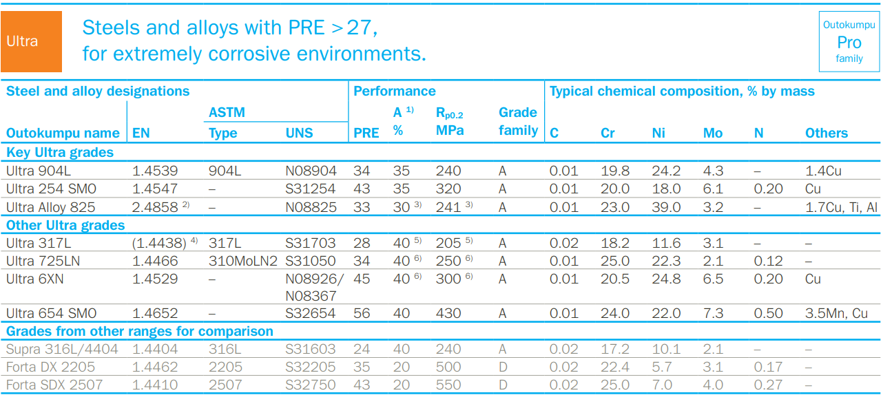 通常, Supra 316L用于一般腐蚀环境,Ultra 904L、Ultra 254 SMO和Ultra 6XN是湿腐蚀环境的理想选择,其中Ultra 254 SMO由于其高强度和相对较低的镍含量而具有成本优势。当需要更高强度时,双相钢成为最佳选择,如Forta LDX 2101, Forta DX 2205和Forta SDX 2507。对于极具腐蚀性的环境,推荐使用Ultra系列不锈钢。其中包括Ultra Alloy 825,这是一种镍合金,可以承受酸性环境,因此非常适用于油气管道。