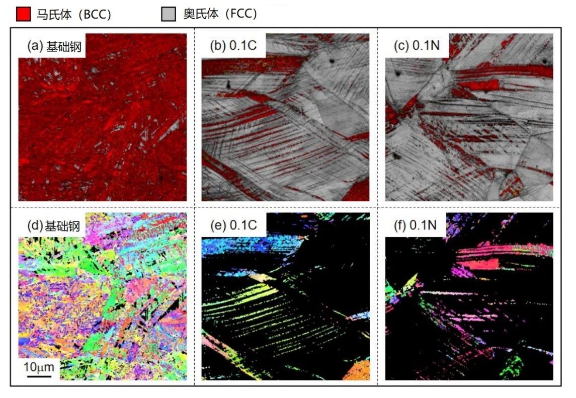 图2显示了基础钢(a)(d),0.1C钢(b)(e),以及0.1N钢(c)(f)冷轧20%后的相+图像质量(IQ)图(a)-(c)以及由DIM(BCC)提取的晶体取向图。在相图中,奥氏体(FCC)和DIM (BCC)分别为灰色和红色。在母钢中,大部分奥氏体转变为DIM,并观察到几微米的细块。在0.1C和0.1N钢中,DIM晶粒在奥氏体晶粒内部沿直线排列,显示DIM在奥氏体内的板状结构 ,包括形变孪晶和ε马氏体内形核。4-6,14-16) DIM的块状尺寸较细,与母钢相似。C和N对奥氏体力学稳定性的影响、转变机理以及DIM的晶体学特性等方面的研究已经在以前的报道中得到了详细的研究。