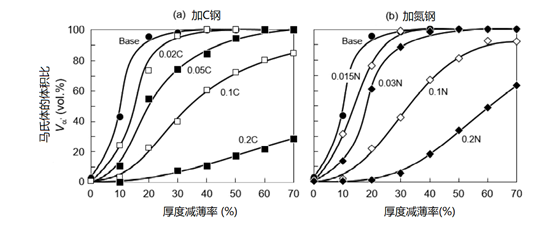 图1 加C钢与加N钢在冷轧后DIM体积分数与厚度减薄率的关系