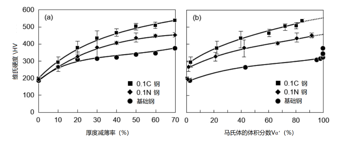 图5 Fe-18Cr-8Ni-(C,N)合金冷轧70%后DIM(实心标记)与Fe-12Cr-(C,N)合金淬火后的非热马氏体(空心标记)的维氏硬度变化