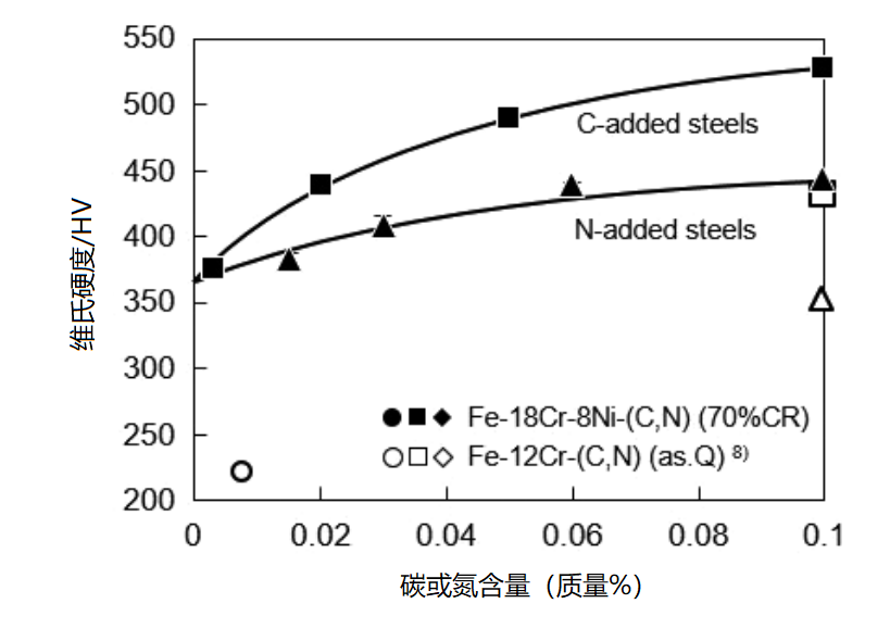 从上述观点来看,C和N的作用是不同的;C比N更能提高奥氏体的力学稳定性,而人们普遍认为C比N更能提高淬火形成的非热马氏体的硬度。因此,C和N对亚稳奥氏体钢加工硬化行为的影响是不同的;然而,并没有进行系统的调查。