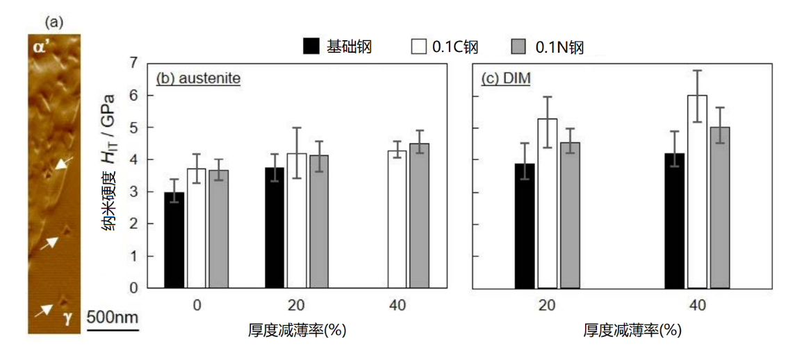 图4 0.1N钢在冷轧20%后的扫描探针图(a)。基础钢、0.1C钢以及0.1N钢在冷轧后奥氏体(b)与DIM(c)的纳米硬度。