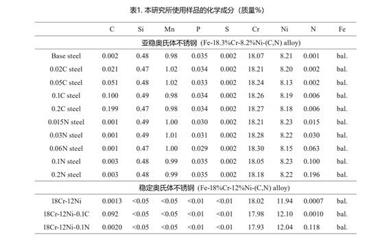 亚稳奥氏体不锈钢,以Fe-18%Cr-8%Ni合金为代表,已知在变形过程中会发生形变诱导马氏体相变(DIMT),从而导致相变诱导塑性(TRIP)效应。由于TRIP效应,这种类型的钢表现出适度的加工硬化,并且一直持续到变形的后期阶段,在拉伸试验中表现出较大的均匀伸长率,以及优异的冲压成形性。此外,亚稳奥氏体不锈钢可以通过冷加工显著提高其强度,因而广泛应用于高强度板钢和线材。对于需要进一步强化的应用,通过添加C和N来增强钢的加工硬化。例如,SUS301 (C < 0.15%), SUS304N1 (0.1% < N < 0.25%)等实际应用为高强度弹簧,汽车结构材料等。因此,为了提高不锈钢板材和钢丝的成形性和强度,有必要准确了解C和N对DIMT及其伴随的加工硬化的影响。