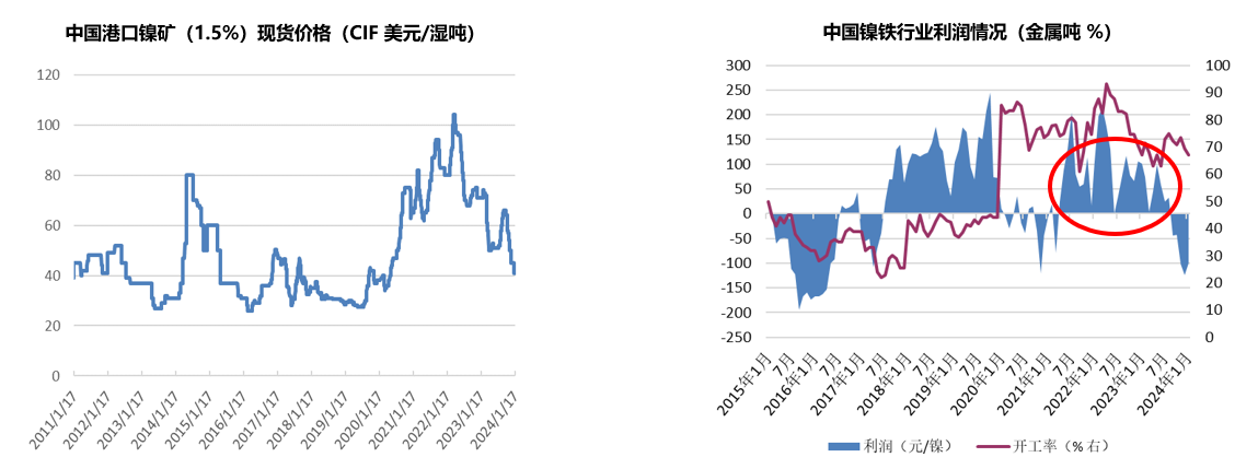 从全年镍矿、镍铁价格走势来看,2023年镍矿价格呈现过山车势行情,年初1.5%品位镍矿价格高位下跌,持续到4-5月份,由70-72美金跌至50美金(CIF)。7月底8月初开始价格反弹,印尼RKAB事件,以及中国开始备货,价格由50美金涨到66-68美金。四季度供应紧张矛盾缓解,需求出现坍塌,价格再次出现回落。截止到12月底,价格跌至45美金,扣除菲律宾到中国的海运费10-11美金,菲律宾出口价格35美金(FOB)上下,略有微利。