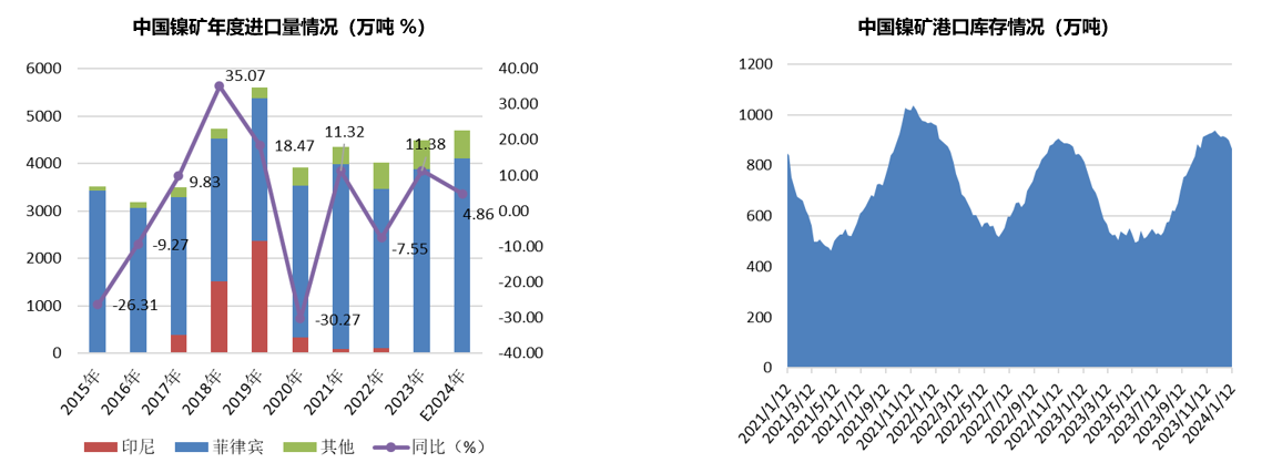 全球与不锈钢有直接关系的镍矿、镍铁产业链,近两年中国镍铁产量占比不断下降,印尼占比连续提高,主要是受印尼禁止镍矿出口政策和生产成本所制约,目前中国镍铁生产原料镍矿主要来自于菲律宾。海关数据显示,2023年,中国镍矿进口总量为4481.9万吨,同比增加457.82万吨,增幅11.38%。其中,自菲律宾进口镍矿总量3871.6万吨,同比增幅15.7%。预计2024年中国镍矿进口量或将有所减少,中高镍矿量将维持,0.3%以下低品位进口量或将减少。镍矿进口保持增长,使得国内港口镍矿库存量始终维持正常水平。据中联金统计,截止2024年1月12日国内12个主要港口红土镍矿库存约865万吨,去年同期库存约813万吨,同比增加52万吨。