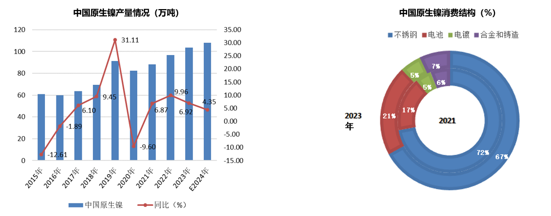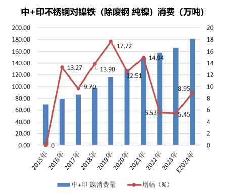 从不锈钢行业对于原生镍的消费情况来看,2023年中国和印尼不锈钢行业对原生镍消费量为166.56万吨(扣废钢、精炼镍贡献),同比增幅5.45%。消费增幅明显弱于供应量增幅,产量增幅6.92%。预计2024年中国和印尼300系不锈钢产量将继续保持增加,那么对于原生镍的消费量也将增加,预计将增至180万吨上下,增幅8-9%。