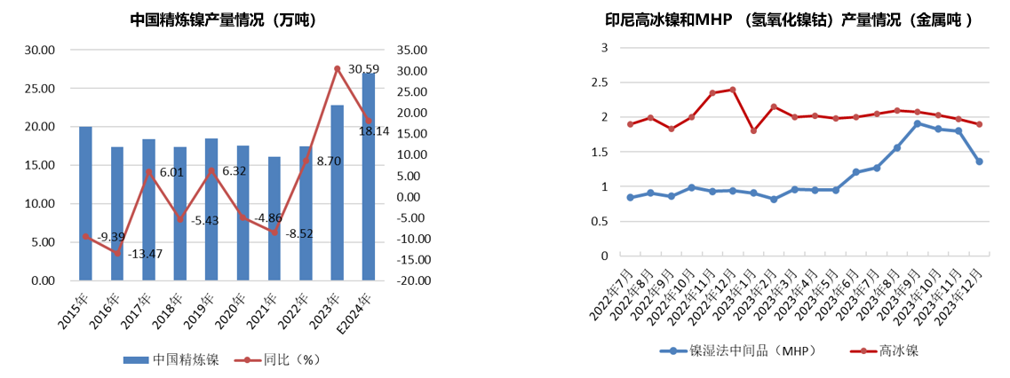 另外,2023年二者新项目继续投建中,2024年预计产量将再增加,但是由于价格的大幅回落,会影响投产速度,尤其是高冰镍相比于MHP成本高,高冰镍的新项目将放缓,致使精炼镍产量增幅下降。