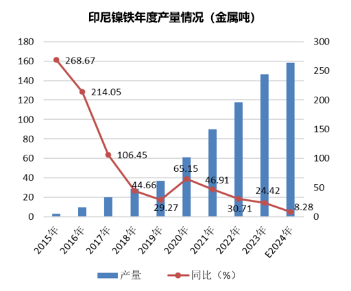 中国产量连续性减少,印尼产量的快速增加,弥补了国内钢厂对于镍铁的需求增量。据中联金统计,2023年印尼镍铁产量为146.39万吨(金属量),同比增加28.74万吨,增幅24.4%。海关数据显示,2023年,中国镍铁进口量为844.98万吨(实物吨),同比增加255.36万吨,增幅43.31%。其中,自印尼进口镍铁量791.51万吨,同比增加252.49万吨,增幅46.84%。预计2024年,印尼镍铁产量有望增至158-159万吨,增幅将放缓至8-8.5%。今年全球镍铁供需进入了过剩的局面,尤其是在下半年。未来印尼镍铁新增产能将放缓,增量主要体现在新能源动力电池领域所需的镍产品。