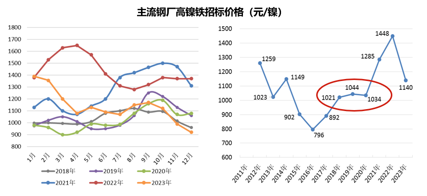镍铁方面,2023年国内主流不锈钢厂高镍铁招标价格呈现下跌态势,价格逐步回归理性。年初价格最高到1390-1400元/镍,年末跌至900-910元/镍,全年均价在1140元/镍,较2022年下降300-310元/镍。今年价格之所以下跌,主要是印尼低成本镍铁产量的快速增加,给国内市场带来一定压力。以2023年12月为例,中国镍铁生产成本集中在1040-1050元/镍,印尼则为850元/镍上下,印尼回到国内成本最高不过900元。
