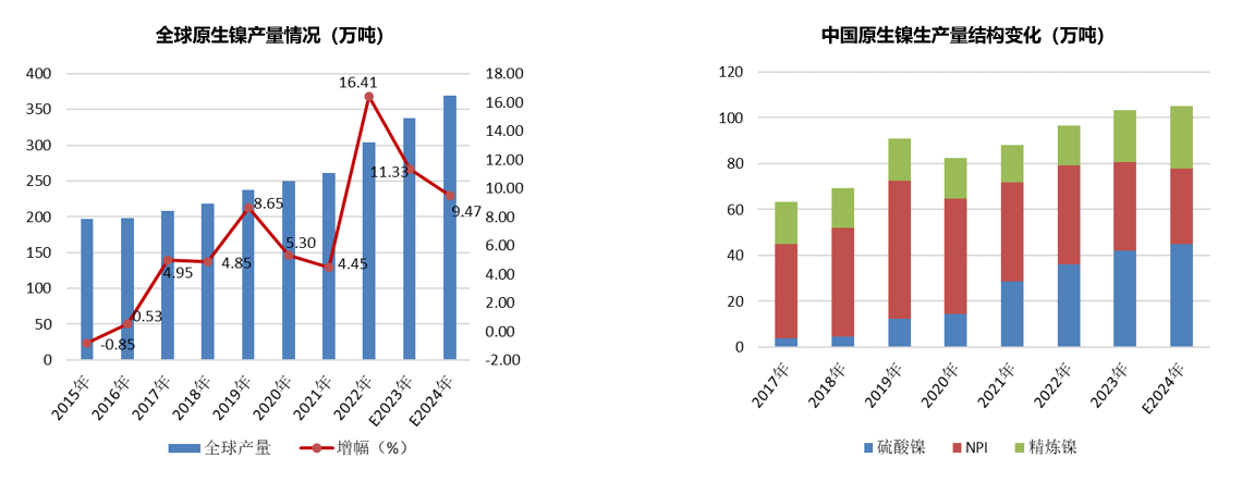 据中联金预计,2023年全球原生镍总产量约为338万吨,同比增长约11.33%。全球原生镍产量中,中国和印尼产量占比达到70%。其中,2023年中国原生镍产量为103.5万吨,同比增加6.7万吨,增幅6.92%。中国从产品结构看,镍铁贡献的占比在下降,精炼镍贡献占比大幅度提高,中国精炼镍增量部分主要体现在印尼回国高冰镍和MHP。2023年中国精炼镍产量达到22.85万吨,同比增加5.35万吨,增幅30.59%;国内新增产量主要是集中在青山、华友、格林美、中伟,新增产能11万吨。