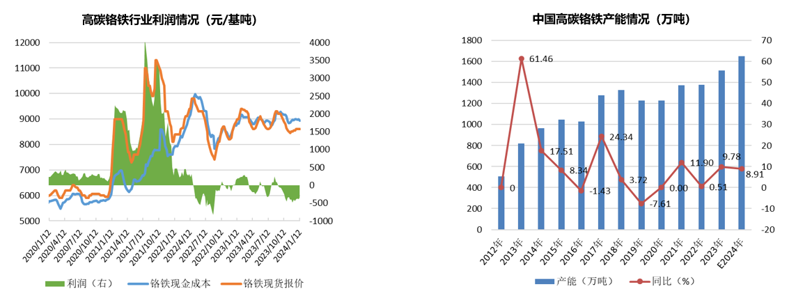同时,海外新产能也在投产并释放,印尼青山继2023年后,2024年40万吨/年高碳铬铁新增项目投产后,高碳铬铁基本实现自供。津巴布韦2024年新增高碳铬铁产能约17万吨。其他国家在高利润驱使下,产能利用率将保持高位,因此判断2024年全球高碳铬铁供应量将保持充足,多余的高碳铬铁都将流向中国。
