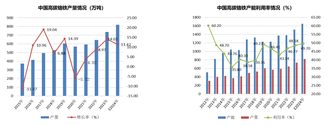 中国高碳铬铁产量情况,过去2021年-2023年上半年,中国铬铁工厂始终保持有利润状态,尤其是过去两年利润较为丰厚,刺激部分铬铁企业扩大新建产能。据统计,2022年,国内高碳铬铁产量645.4万吨,同比增加53.2万吨,增幅8.97%,单月平均产量在54万吨。2023年总产量增加至736万吨,同比增加90.6万吨,同比增加14.02%,单月产量增加至61.3万吨,同比增加7万吨。过去两年中国高碳铬铁产能利用率仅在44%上下,今年略有提高至48-49%,但是总体产能依旧偏低,2023年中国高碳铬铁产能在1500万吨。2024年中国新增高碳铬铁产能约170万吨,实际可以落地生产的约在140-150万吨,总产能将达到1650万吨。届时新产能逐步投产后,预计2024年中国高碳铬铁产量将增至800万吨以上,单月产量提高到65-70万吨。