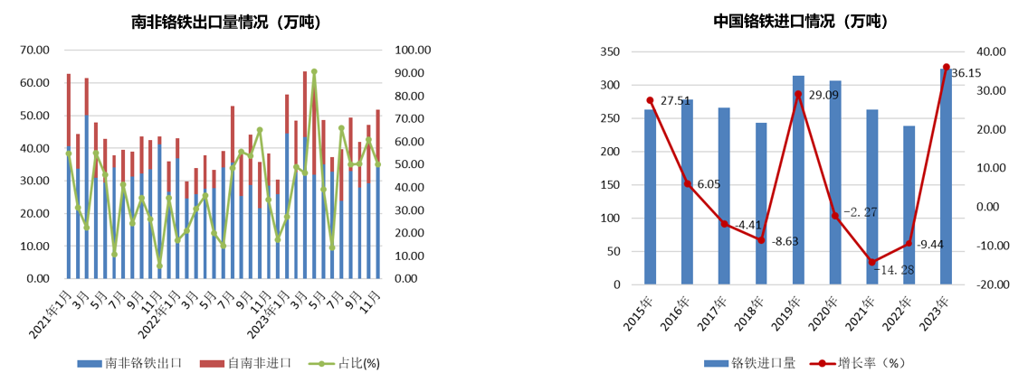 全球高碳铬铁市场,据ICDA统计,预计2023年全球高碳铬铁总产量接近1600万吨,同比增加130-140万吨,增幅约8.5%。中国铬铁产量虽然保持增势,且今年增幅较为明显。但是进口也是主要的供应渠道,全球铬铁应该中,南非是主要供应国。据海关数据显示,2022年,南非铬铁出口总量为343万吨,同比减少69万吨,降幅16.75%。2023年1-11月份,南非铬铁出口量为369万吨,同比增加52万吨,增幅16.4%。而中国海关数据,2023年,中国铬铁进口总量为324.14万吨,同比增幅36.5%。其中,自南非进口总量为188.44万吨,同比增加73.34万吨,增幅63.72%。自哈萨克斯坦进口总量为71万吨,同比增加12.81万吨,增幅22.02%。自印度进口总量为36.23万吨,同比增加7.25万吨,增幅25.02%。自津巴布韦进口总量为20.33万吨,同比减少5.22万吨,降幅20.43%。