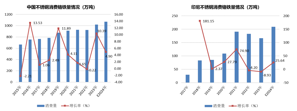 2023年全年不锈钢粗钢产量继续保持增长,中国表现尤为突出。2024年此状态不仅可以维持,印尼将再次恢复到正增长的状态,因此对于高碳铬铁的消费将保持高位。据中联金统计,中国2023年不锈钢消费铬铁量将增加至1021万吨,增幅10.4%。预计2024年增至1070-1075万吨,同比增长约5-5.5%。印尼2023年不锈钢消费铬铁量将下降至166万吨,降幅8.9%。预计2024年将恢复至205-210万吨,增幅约25%以上。