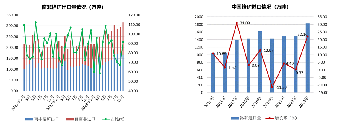 据海关数据显示,2022年,南非铬矿出口总量为1410万吨,同比增加53万吨,增幅39.06%。2023年1-11月份,南非铬矿出口量为1626万吨,同比增加323万吨,增幅24.8%。而中国海关数据,2023年,中国铬矿进口总量为1833.26万吨,同比增加22.3%。其中,自南非进口铬矿的总量为1491.81万吨,同比增加260.07万吨,增幅21.11%;自土耳其进口铬矿的总量为109.85万吨,同比增加14.72万吨,增幅15.48%;自津巴布韦进口总量为68.6万吨,同比增加22.45万吨,增幅48.63%。