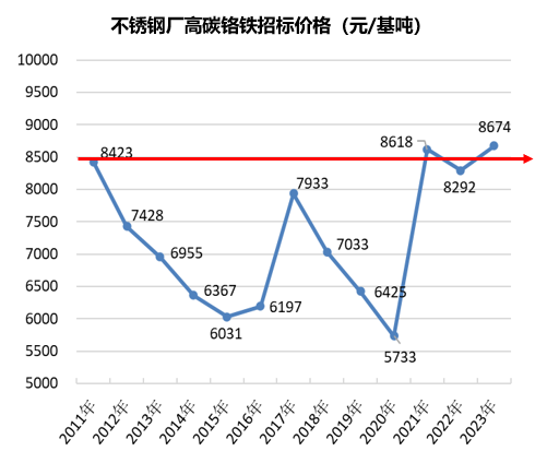 对于2024年高碳铬铁价格预测,2023年由于国内不锈钢产能集中释放,且废钢使用利润下降,导致铬铁保持旺盛需求。同时,铬铁高供应量有效抑制了铬铁的涨价和波动空间,但是高铬矿价始终支撑铬铁价格。总体来看,近三年高碳铬铁价格处于较高水平,即年度均价在8670元/基吨。预计2024年铬铁价格有望小幅回落,但是幅度较为有限,均价略回落至8400-8500元/基吨上下。高供应很难出现暴涨暴跌的情况。