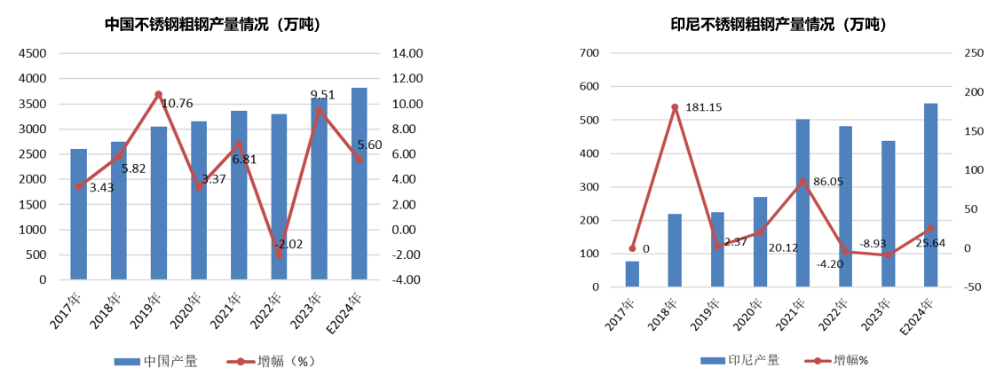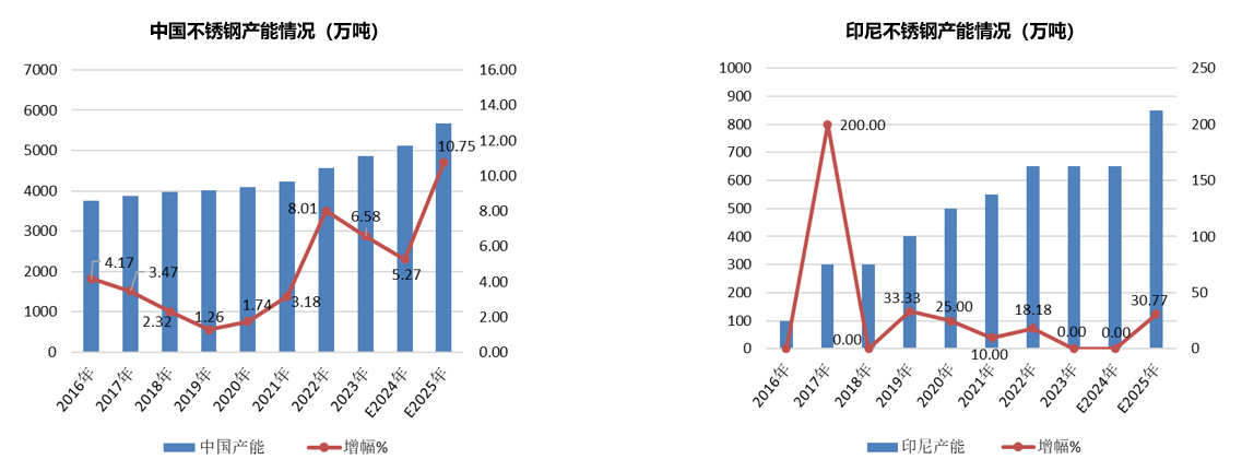 2024年及未来两年,中国和印尼仍有新的炼钢产能投产,海外其他国家,除印度以外,基本维持平稳。据中联金统计,2024年中国将新增释放产能256万吨(内蒙经安有色80万吨,溧阳德龙176万吨),总产能将达到5114万吨,增幅5.3%。到2025年将继续增加至5664万吨,环比增幅10%以上。印尼2024年不锈钢产能将维持在650万吨,到2025年将新增200万吨,达到850万吨,环比增幅30.77%。