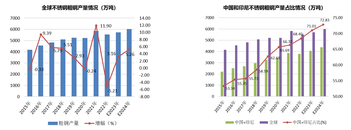 按照产能的不断投产及释放,预计2024年全球不锈钢粗钢总产量将增至6000-6050万吨,同比增幅5.3-6%。其中,预计2024年中国不锈钢粗钢总产量增至3820-3850万吨,同比增加约210-230万吨,增幅约6%左右。其中,300系:预计2024年产量将增至2000万吨,同比增幅约8.1-8.2%。200系:预计2024年产量为1140万吨,同比增幅约2-2.1%。400系:预计2024年产量为 670-680万吨,同比增幅约7-7.5%。印尼不锈钢粗钢总产量增至540-550万吨,同比增加约100万吨,增幅约24-25%;印尼几乎全部为300系。2024年中国和印尼的不锈钢粗钢总产量为4370-4390万吨,同比增幅约为8%,占全球比例提高到74%。