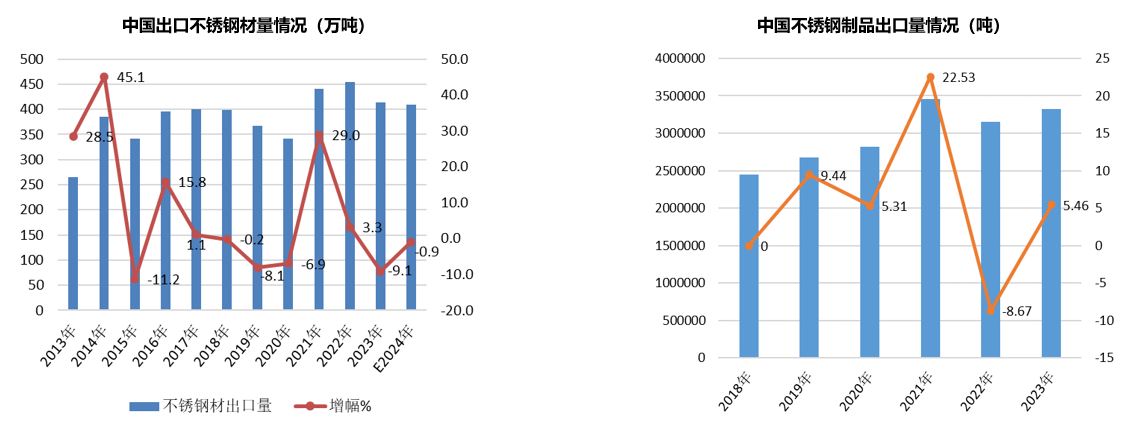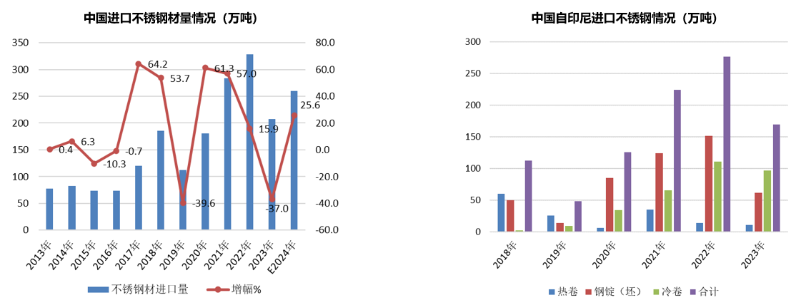 2023年不锈钢进口量下降较为明显,主要是印尼回国量的减少,体现在方坯产品。而出口量下降是意料之内,但是降幅明显好于预期,主要是不锈钢制品的出口量维持较高水平,制品出口主要是部分东南亚国家产业链转移后配套设施不完善,需要自中国进口。预计2024年制品出口将继续保持增势。同时预计2024年不锈钢出口将继续微降,至400万吨上下,降幅2%左右。预计2024年将略有回升,至260万吨,增幅24%左右;将主要体现在印尼的型材方坯。