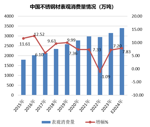 2023年中国不锈钢表观消费量表现良好。据中联金统计,2023年中国不锈钢材表观消费量为3153.03万吨,同比增加211.81万吨,增幅7.21%。二三四季度均超过去年同期水平。低价资源对于消费来说将是利好。预计2024年将继续保持增长,增幅或将略有放缓至7%,达到3400万吨上下。今年总体来讲,工业领域需求保持良好,民用领域相比略差,尤其是与房地产相关的行业。明年新能源、化工领域或将出现略降,但是房地产相关行业或将弥补增量。