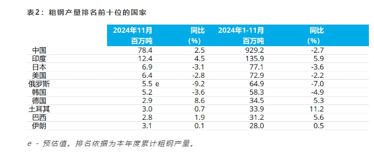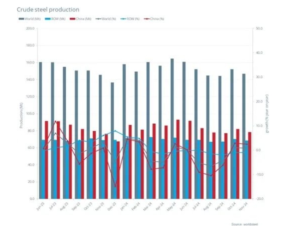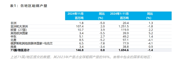 2024年11月全球71个纳入世界钢铁协会统计国家/地区的粗钢产量为1.468亿吨,同比提高0.8%。