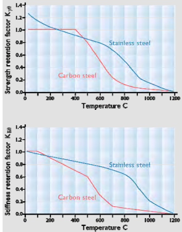 模组的防火定级达到H60级,这就意味着它们必须在暴露于碳氢化合物着火环境中60分钟而依然保持其承载功能。碳氢化合物着火60分钟后,温度会达到1100℃。奥氏体不锈钢展现出与碳钢不同的强度和屈服性能(图4)。典型1.4401钢在1100℃时保持了约6%的0.2%屈服强度,而碳钢只保持了3%的屈服强度。