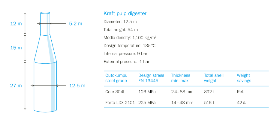 与304L相比,高铬含量提高了抗所有类型腐蚀的能力,而高氮含量有助于提高抗点蚀和缝隙腐蚀的能力。与奥氏体304L和316L相比,双相不锈钢通常在含环境压力的氯化钠溶液中具有更好的抗应力腐蚀开裂能力。Forta LDX2101在硫酸盐制纸浆蒸煮器中的应用 高强度双相不锈钢的优点在硫酸盐制纸浆蒸煮器中得到验证,如图1所示。由于Forta LDX2101可以承受更高的应力,其壁厚几乎只需要奥氏体不锈钢304L的一半,从而节省了数百吨的材料。图1 -根据EN 13445标准,奥氏体不锈钢和双相不锈钢设计压力容器的材料减重 图2显示了在建造硫酸盐制纸浆蒸煮器时,镍的价格如何影响总体材料成本。计算中包含了高强度双相不锈钢的减重。很容易看出Forta LDX2101价格的稳定性和可预测性。最重要的是,Forta LDX2101是一种更具成本效益的替代方案。在制造和施工过程中考虑潜在的节约也很重要。这是因为由Forta LDX2101制成的容器重量更轻,并且焊接和材料处理工序更少,建造成本更低。Forta LDX2101也可以应用于处理碱性纸浆液和黑液蒸发器的罐体。