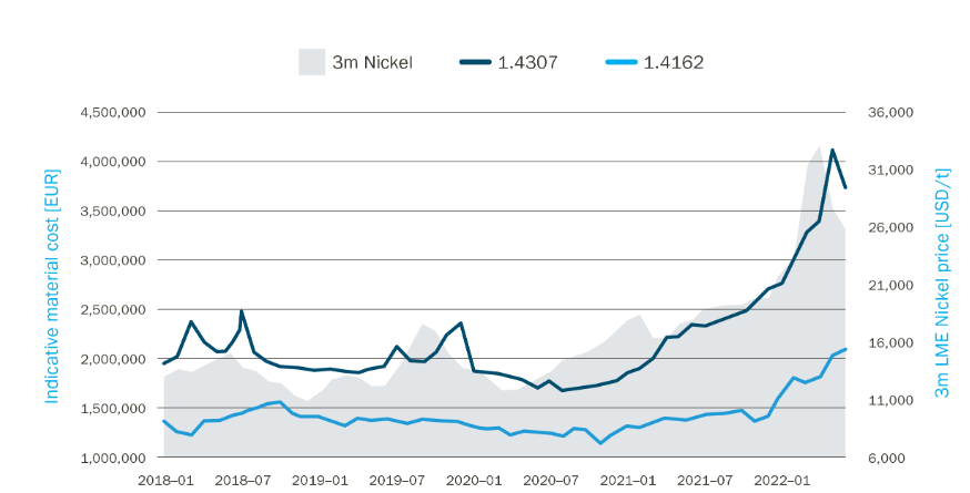 镍合金化使普通不锈钢牌号(304L和316L)在室温下具有完全的奥氏体组织。降低镍含量可以实现双相组织,从而形成双相不锈钢。较低的镍含量意味着可以维持稳定的价格。 普通双相不锈钢的典型含镍量为4 ~ 7%。节约型双相不锈钢Forta LDX2101通过增加氮、铜、锰等其它奥氏体形成元素的含量,将镍含量进一步降低到1.5- 4.0%。Forta LDX2101的耐蚀性是通过高铬、高氮含量和低钼合金化来实现的。
