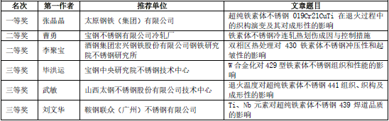 分会评出“2016年中国第五届国际400系不锈钢会议”优秀论文