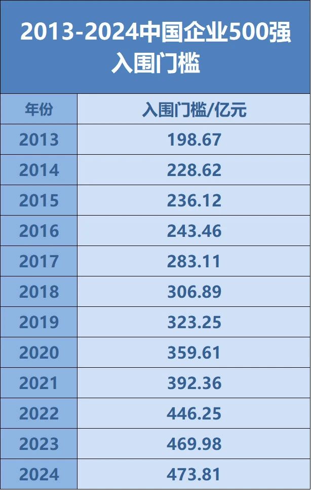 2024中国企业500强入围门槛达到473.81亿元,提升3.83亿元,实现22连升。