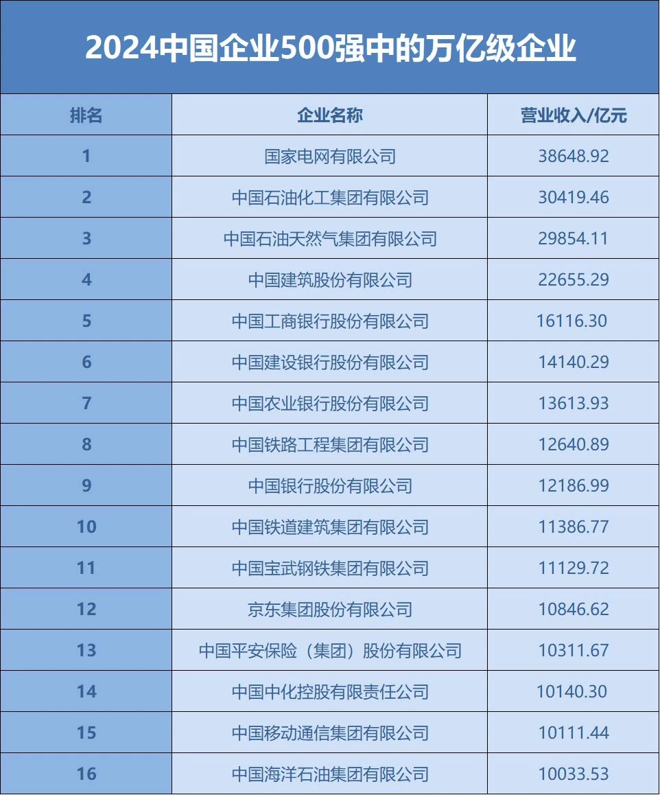 2024中国企业500强中,营业收入超过1000亿元的企业数量为253家,占比超过50%;有16家企业营业收入超过了1万亿元。