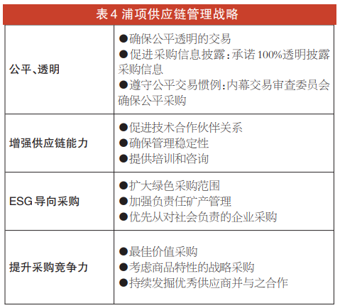 随着全球对供应链人权和环境问题的法规日益严格,浦项制订了“公平、透明,增强供应链能力,ESG导向采购,提升采购竞争力”,4项供应链管理关键战略(如表4所示),开展提高整个供应链可持续性的各项活动,积极构建强大的产业生态圈,成为“可持续采购的全球领导者”。