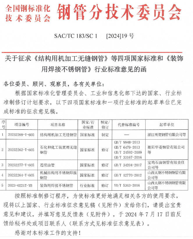 日前,由山西太钢不锈钢钢管有限公司等单位起草的国家标准《机械结构用不锈钢焊接管》、行业标准《装饰用焊接不锈钢管》已完成标准的征求意见稿。