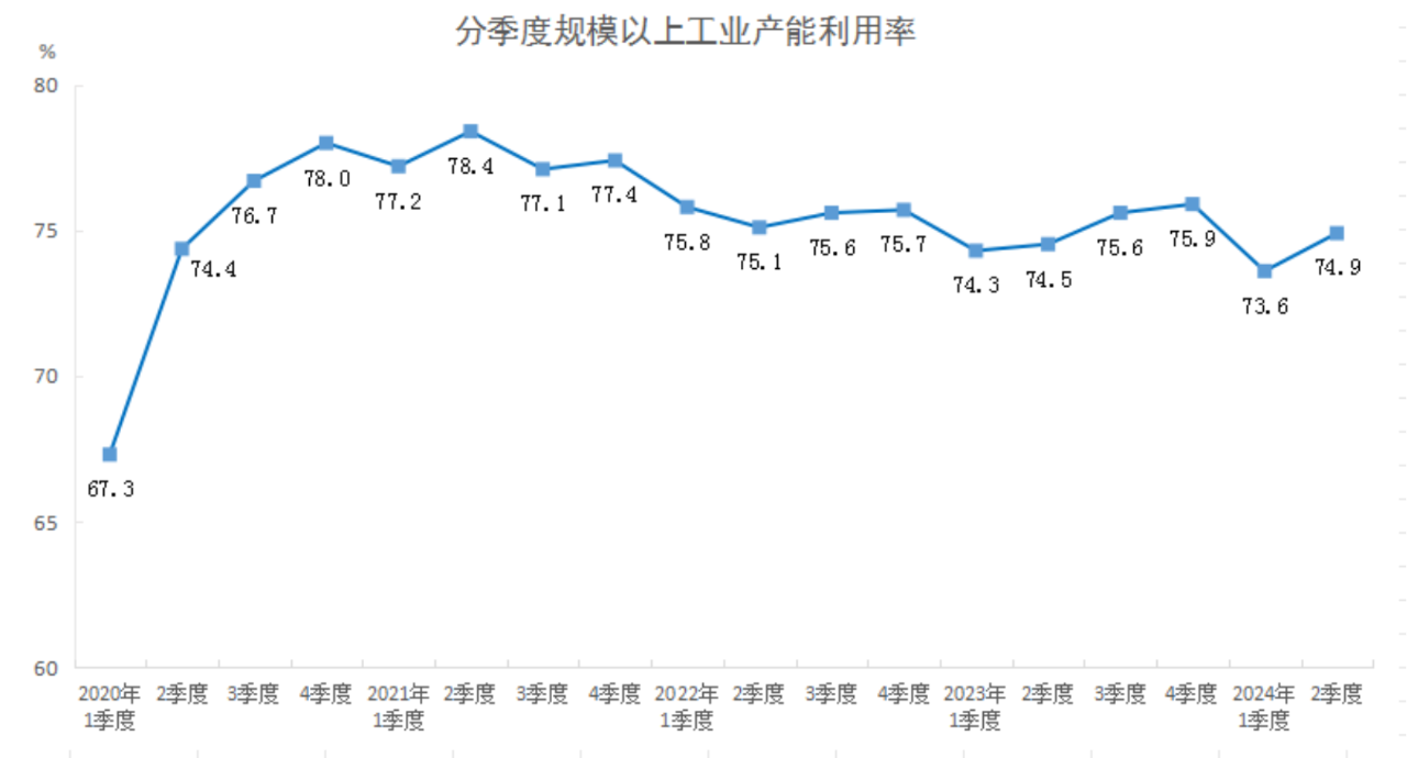 2024年二季度,全国规模以上工业产能利用率为74.9%,比上年同期上升0.4个百分点,比一季度上升1.3个百分点。