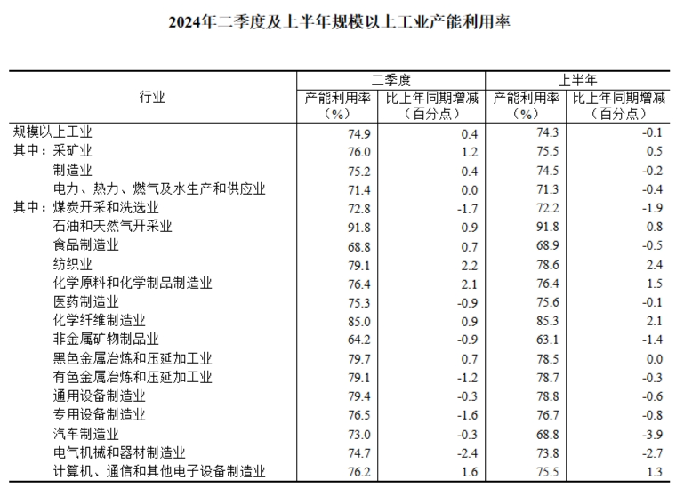 分主要行业看,2024年二季度,煤炭开采和洗选业产能利用率为72.8%,食品制造业为68.8%,纺织业为79.1%,化学原料和化学制品制造业为76.4%,非金属矿物制品业为64.2%,黑色金属冶炼和压延加工业为79.7%,有色金属冶炼和压延加工业为79.1%,通用设备制造业为79.4%,专用设备制造业为76.5%,汽车制造业为73.0%,电气机械和器材制造业为74.7%,计算机、通信和其他电子设备制造业为76.2%。