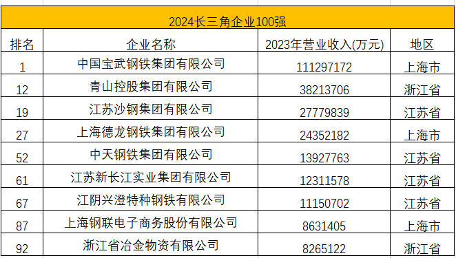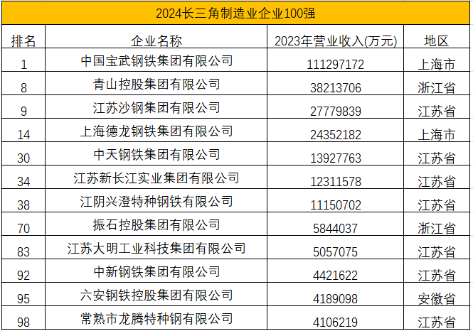 多家钢铁及相关企业进入2024长三角企业100强和2024长三角制造业企业100强,具体名单如下: