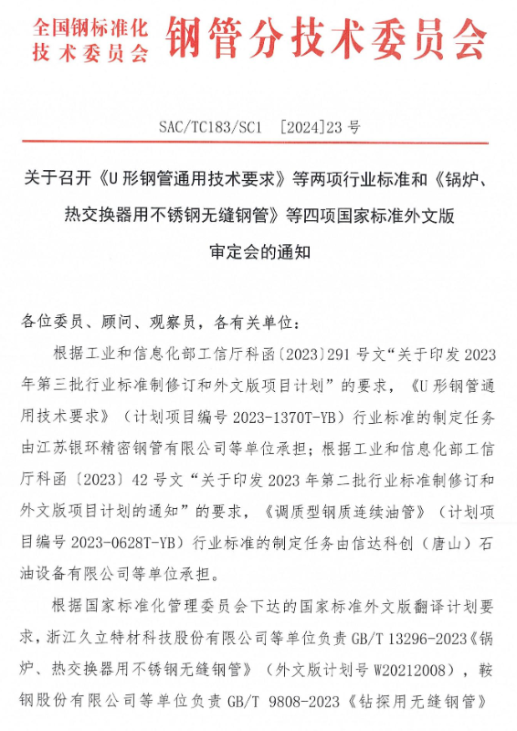 日前,由浙江久立特材科技股份有限公司等单位负责GB/T13296-2023《锅炉、热交换器用不锈钢无缝钢管》(外文版计划号W20212008)等6项标准现已形成送审稿,此6项标准外文版审定会将于2024年7月31日-8月2日在云南省昆明市召开。
