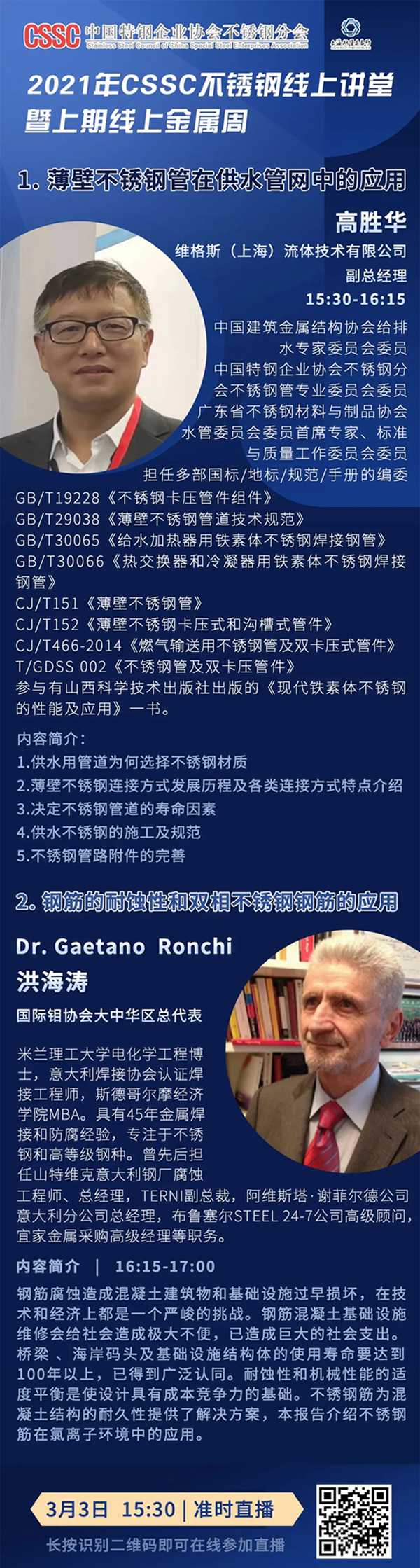 2021年CSSC不锈钢线上讲堂暨上期所线上金属周:薄壁不锈钢管在供水管网中的应用/钢筋的耐蚀性和双相不锈钢钢筋的应用