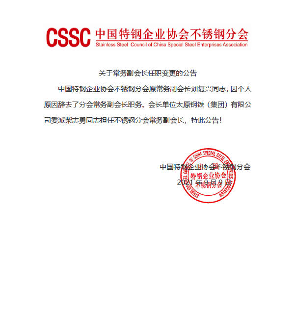 中国特钢企业协会不锈钢分会原常务副会长刘复兴同志,因个人原因辞去了分会常务副会长职务。会长单位太原钢铁(集团)有限公司委派柴志勇同志担任不锈钢分会常务副会长。