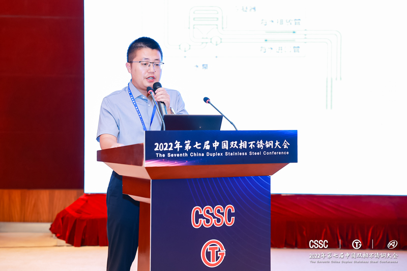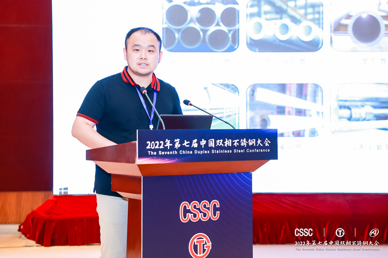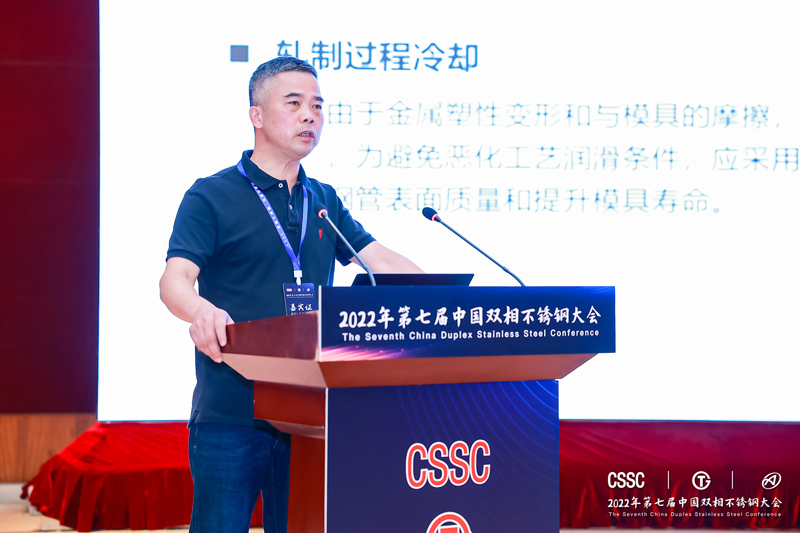 中达新材料技术副总经理陈小福作报告《热交换器用022Cr25Ni7Mo4N超级双相钢无缝钢管冷成型性能研究》